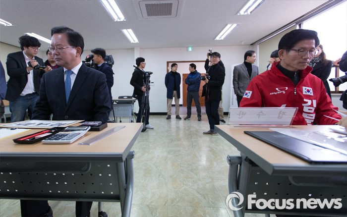 (대구=포커스뉴스) 24일 오전 대구 수성구 선거관리위원회에서 김문수(오른쪽) 새누리당 전 의원과 김부겸 더불어민주당 전 의원이 20대 총선 국회의원 후보 등록을 하고 있다.