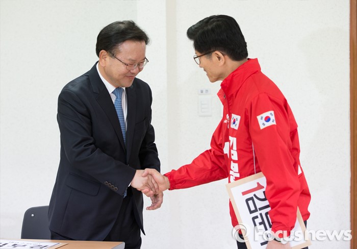 (대구=포커스뉴스) 24일 오전 대구 수성구 선거관리위원회에서 김문수(왼쪽) 새누리당 전 의원과 김부겸 더불어민주당 전 의원이 20대 총선 국회의원 후보 등록에 앞서 악수를 나누고 있다.