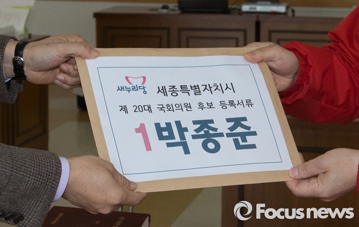 (세종=포커스뉴스) 제20대 국회의원 선거 후보자 등록 첫날인 24일 오전 세종시 조치원읍 세종시선거관리위원회에서 새누리당 박종준 후보가 등록 신청서를 제출하고 있다.
