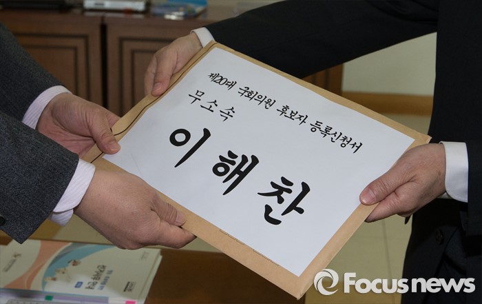 (세종=포커스뉴스) 제20대 국회의원 선거 후보자 등록 첫날인 24일 오전 세종시 조치원읍 세종시선거관리위원회에서 무소속 이해찬 후보의 대리인이 등록 신청서를 제출하고 있다.