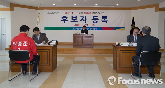 (세종=포커스뉴스) 제20대 국회의원 선거 후보자 등록 첫날인 24일 오전 세종시 조치원읍 세종시선거관리위원회에서 새누리당 박종준 후보와 무소속 이해찬 의원의 대리인이 후보 등록을 하고 있다.
