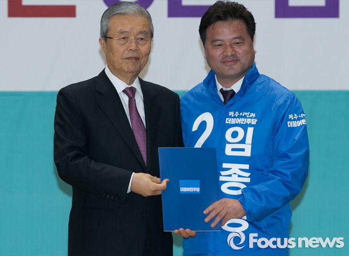 (서울=포커스뉴스) 김종인(왼쪽) 더불어민주당 비대위 대표가 24일 오전 서울 여의도 국회에서 공천장 수여식에 참석해 임종성 경기 광주을 후보에게 공천장을 전달한 뒤 기념촬영을 하고 있다.