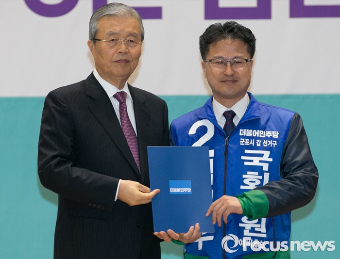 (서울=포커스뉴스) 김종인(왼쪽) 더불어민주당 비대위 대표가 24일 오전 서울 여의도 국회에서 공천장 수여식에 참석해 김정우 경기 군포갑 후보에게 공천장을 전달한 뒤 기념촬영을 하고 있다.