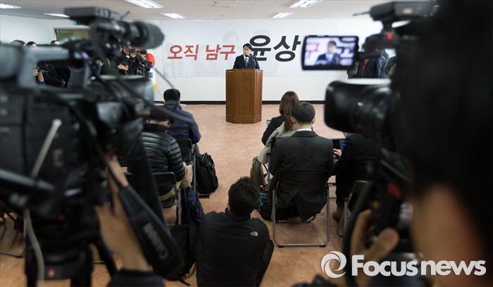 (인천=포커스뉴스) 새누리당을 탈당한 윤상현 의원이 24일 오전 인천 남구 지역구 사무실에서 무소속 출마 선언 기자회견을 하고 있다.