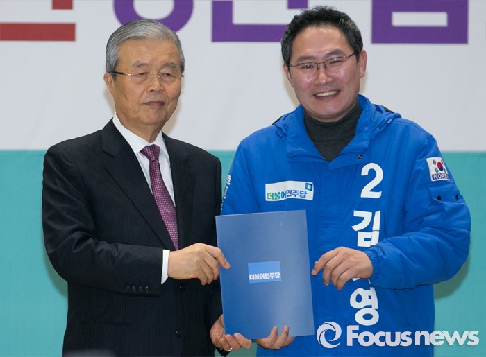 (서울=포커스뉴스) 김종인(왼쪽) 더불어민주당 비대위 대표가 24일 오전 서울 여의도 국회에서 공천장 수여식에 참석해 김기영 서울 서초을 후보에게 공천장을 전달한 뒤 기념촬영을 하고 있다.