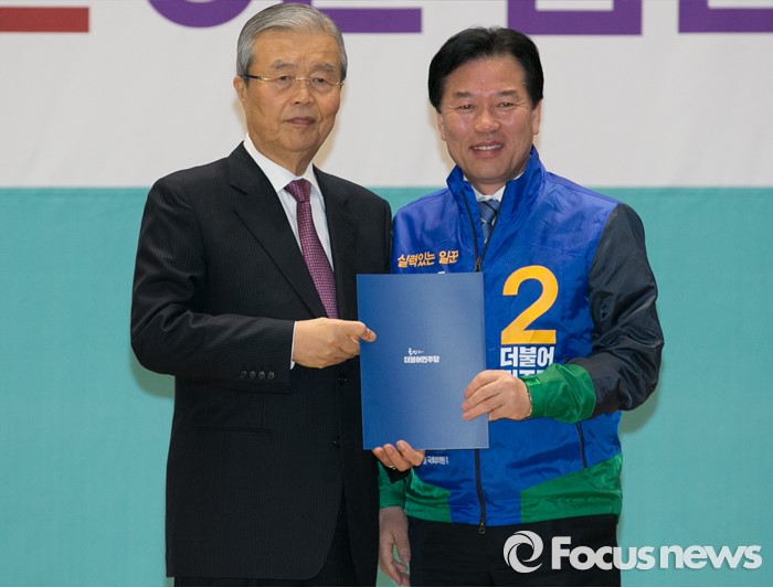 (서울=포커스뉴스) 김종인(왼쪽) 더불어민주당 비대위 대표가 24일 오전 서울 여의도 국회에서 공천장 수여식에 참석해 정태호 서울 관악을 후보에게 공천장을 전달한 뒤 기념촬영을 하고 있다.