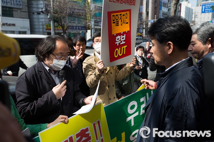 (인천=포커스뉴스) 새누리당을 탈당한 윤상현 의원의 무소속 출마 선언 기자회견이 열린 24일 오전 인천 남구 지역구 사무실 앞에서 2016 체인지 총선네트워크 인천유권자위원회 회원들이 윤상현 의원 출마 규탄 기자회견을 하고 있다.