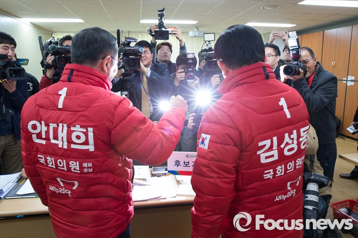 (서울=포커스뉴스) 20대 총선 후보자 등록이 시작된 24일 오전 서울 마포구 선관위에서 김성동(오른쪽) 새누리당 후보와 안대희 후보가 화이팅을 외치고 있다.
