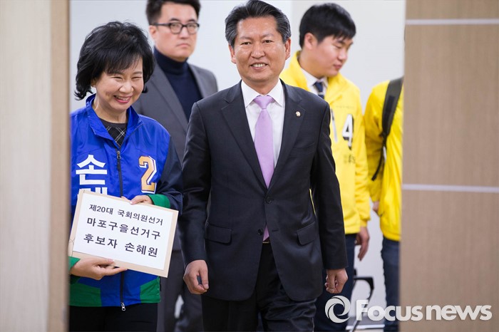 (서울=포커스뉴스) 20대 총선 후보자 등록이 시작된 24일 오전 서울 마포구 선관위에서 더불어민주당 손혜원 후보가 정청래 의원과 등록 서류를 제출하러 들어서고 있다.