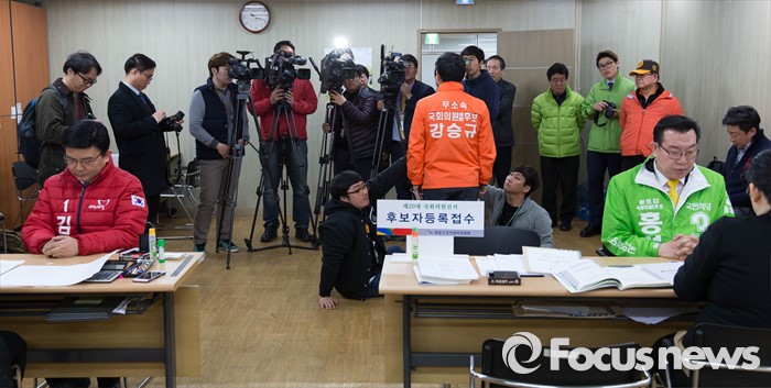 (서울=포커스뉴스) 20대 총선 후보자 등록이 시작된 24일 오전 서울 마포구 선관위에서 각 당의 후보들이 등록 절차를 밟고 있다.