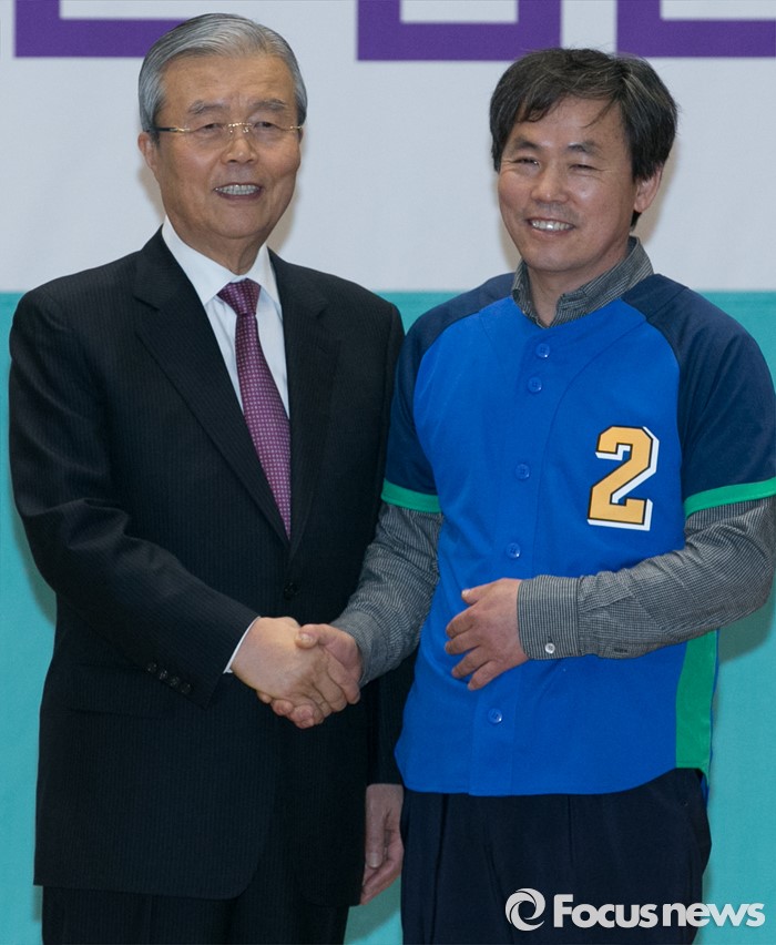 (서울=포커스뉴스) 김종인(왼쪽) 더불어민주당 비대위 대표가 24일 오전 서울 여의도 국회에서 공천장 수여식에 참석해 김현권 비례대표 후보와 기념촬영을 하고 있다.
