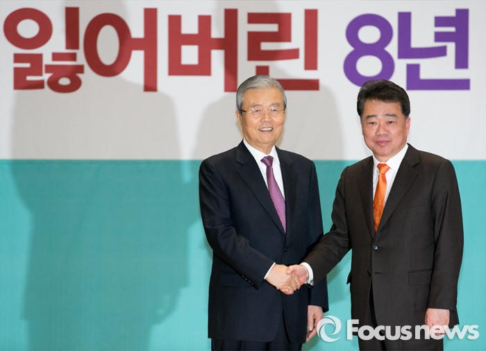 (서울=포커스뉴스) 김종인(왼쪽) 더불어민주당 비대위 대표가 24일 오전 서울 여의도 국회에서 공천장 수여식에 참석해 김성수 비례대표 후보와 기념촬영을 하고 있다.