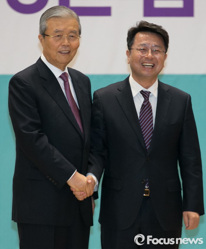 (서울=포커스뉴스) 김종인(왼쪽) 더불어민주당 비대위 대표가 24일 오전 서울 여의도 국회에서 공천장 수여식에 참석해 이철희 비례대표 후보와 기념촬영을 하고 있다.