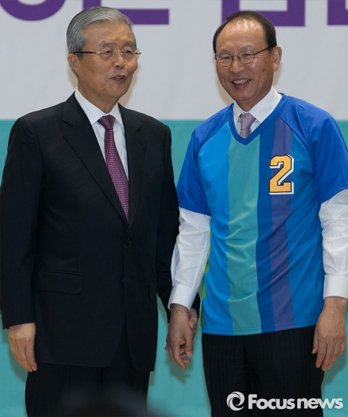 (서울=포커스뉴스) 김종인(왼쪽) 더불어민주당 비대위 대표가 24일 오전 서울 여의도 국회에서 공천장 수여식에 참석해 최운열 비례대표 후보와 기념촬영을 하고 있다.