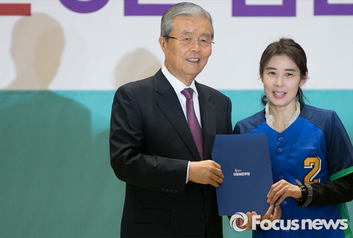 (서울=포커스뉴스) 김종인(왼쪽) 더불어민주당 비대위 대표가 24일 오전 서울 여의도 국회에서 공천장 수여식에 참석해 박경미 비례대표 후보와 기념촬영을 하고 있다.