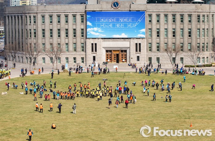 (서울=포커스뉴스) 봄 기운이 완연한 24일 오전 서울광장에서 시민 자원봉사자들이 잔디를 밟아 땅을 다지는 작업을 하고 있다.