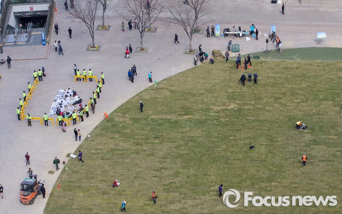 (서울=포커스뉴스) 봄 기운이 완연한 24일 오전 서울광장에서 시민 자원봉사자들이 잔디를 밟아 땅을 다지는 작업을 하고 있다. 잔디밭 좌측에서는 전국금속노조 조합원들이 고 한광호 조합원의 죽음에 대해 현대자동차와 유성기업의 사죄와 책임자 처벌을 촉구하는 집회를 갖고 있다.