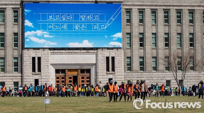 (서울=포커스뉴스) 봄 기운이 완연한 24일 오전 서울광장에서 시민 자원봉사자들이 잔디를 밟아 땅을 다지는 작업을 하고 있다.