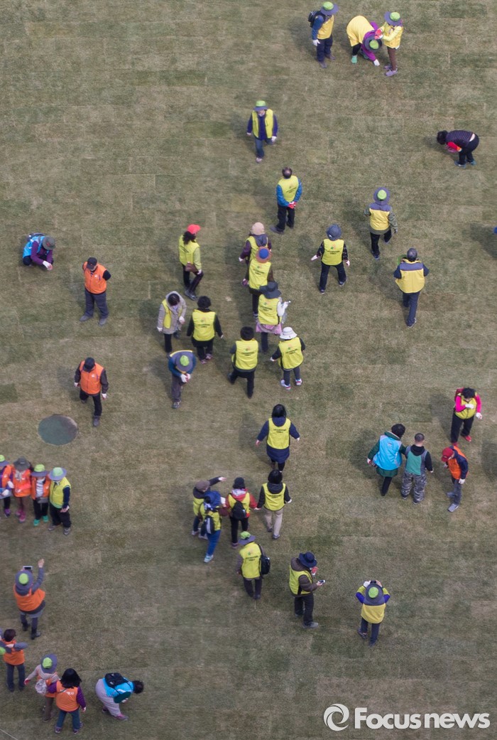 (서울=포커스뉴스) 봄 기운이 완연한 24일 오전 서울광장에서 시민 자원봉사자들이 잔디를 밟아 땅을 다지는 작업을 하고 있다.