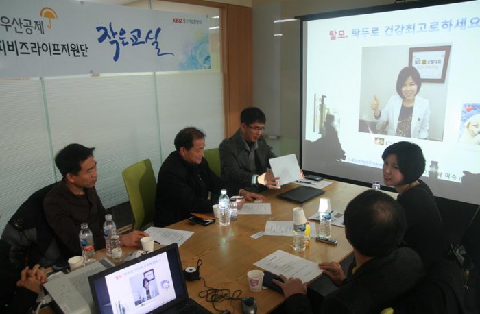 유영호 중기중앙회 노란우산공제사업본부장은 "2014년 8월에 시작된 작은 교실이 2년도 되지 않아 100회를 넘은 만큼 많은 호응이 있었다"며 "앞으로 더욱 노력해 더 많은 소기업, 소상공인 가입자들이 지식을 함께 나누고, 성장해 나가는 희망의 교실을 경험할 수 있도록 하겠다"고 밝혔다.지난 2월11일 중소기업 DMC 소상공인어울림센터에서 탁미숙 대표(맨 오른쪽)가 소상공인들에게 탈모에 대한 상담을 하고 있다.<사진제공=중기중앙회>