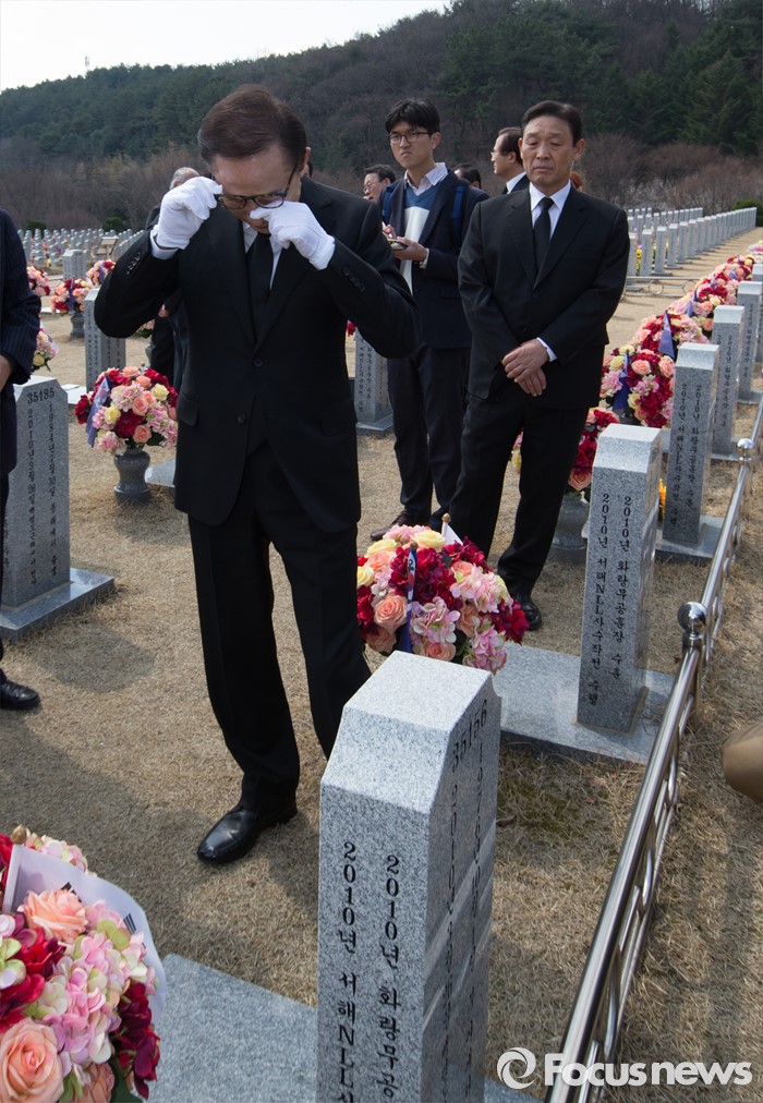 (대전=포커스뉴스) 이명박 전 대통령이 제1회 서해수호의날을 하루 앞둔 24일 오전 대전 유성구 국립대전현충원 천안함 46용사 묘역을 참배한뒤 묘역을 둘러보다 눈물을 닦고 있다.