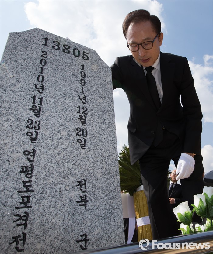 (대전=포커스뉴스) 이명박 전 대통령이 제1회 서해수호의날을 하루 앞둔 24일 오전 대전 유성구 국립대전현충원 연평도 포격 전사자묘역을 둘러보고 있다.
