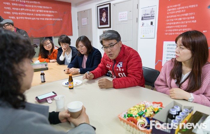 (대구=포커스뉴스) 이재만 예비후보(대구 동구을)가 24일 오후 대구 동구 방촌동의 선거사무소에서 지지자들과 만나 이야기를 나누고 있다.