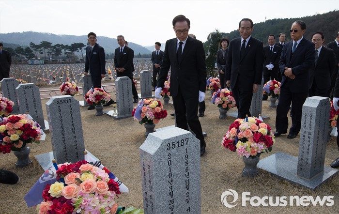 (대전=포커스뉴스) 이명박 전 대통령이 제1회 서해수호의날을 하루 앞둔 24일 오전 대전 유성구 국립대전현충원 천안함 46용사 묘역을 둘러보고 있다.