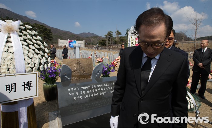 (대전=포커스뉴스) 이명박 전 대통령이 제1회 서해수호의날을 하루 앞둔 24일 오전 대전 유성구 국립대전현충원 천안함 46용사 묘역을 둘러보고 있다.