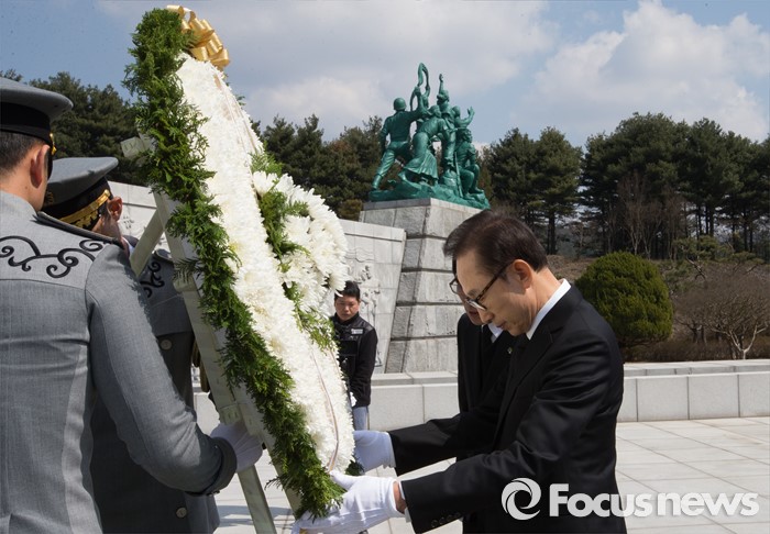 (대전=포커스뉴스) 이명박 전 대통령이 제1회 서해수호의날을 하루 앞둔 24일 국립대전현충원을 참배하고 있다.