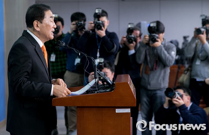(서울=포커스뉴스) 새누리당을 탈당한 이재오 의원이 24일 오후 서울 여의도 국회 정론관에서 20대 총선 무소속 출마 기자회견을 하고 있다.