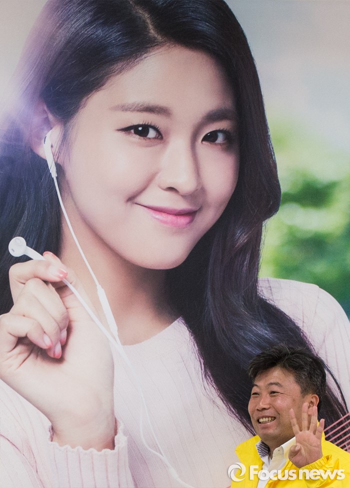 (서울=포커스뉴스) 24일 오후 서울 노원구선거관리위원회를 찾은 주희준 정의당 노원병 후보가 후보자 등록을 마친 후4.13 총선 홍보대사인 설현의 현수막 앞에서 기념촬영을 하고 있다.