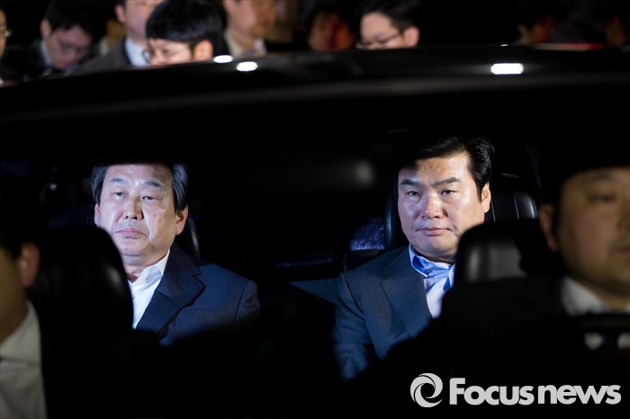 (부산=포커스뉴스) 당 공천관리위원회의 공천안에 반발해 최고위원회의 소집을 거부한 김무성(왼쪽) 새누리당 대표와 설득에 나선 원유철 원내대표가 24일 오후 부산 영도구 김 대표 사무실에서 만난 뒤 자갈치시장으로 향하고 있다.