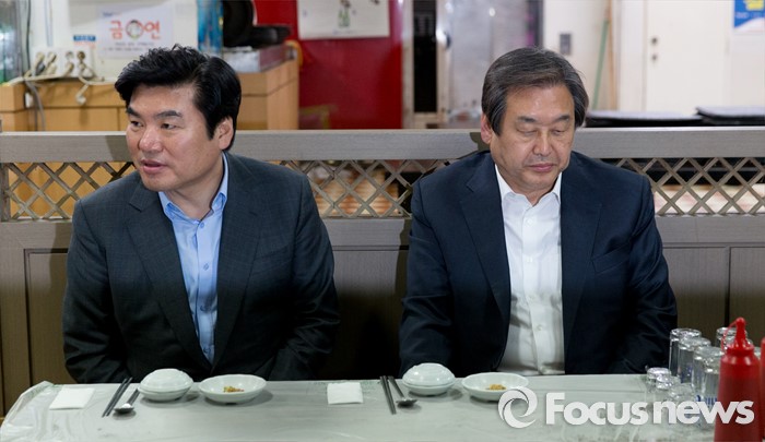 (부산=포커스뉴스) 당 공천관리위원회의 공천안에 반발해 최고위원회의 소집을 거부한 김무성(오른쪽) 새누리당 대표와 설득에 나선 원유철 원내대표가 24일 오후 부산 중구 자갈치시장에서 만나 저녁식사를 하고 있다.