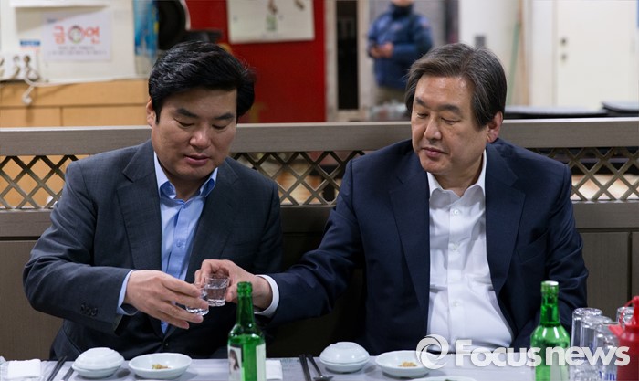 (부산=포커스뉴스) 당 공천관리위원회의 공천안에 반발해 최고위원회의 소집을 거부한 김무성(오른쪽) 새누리당 대표와 설득에 나선 원유철 원내대표가 24일 오후 부산 중구 자갈치시장에서 만나 저녁식사를 하고 있다.
