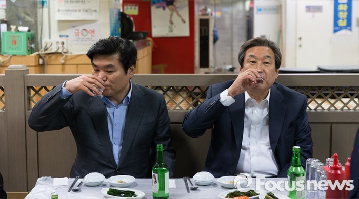 (부산=포커스뉴스) 당 공천관리위원회의 공천안에 반발해 최고위원회의 소집을 거부한 김무성(오른쪽) 새누리당 대표와 설득에 나선 원유철 원내대표가 24일 오후 부산 중구 자갈치시장에서 만나 저녁식사를 하고 있다.