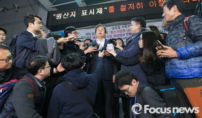 (부산=포커스뉴스) 당 공천관리위원회의 공천안에 반발해 최고위원회의 소집을 거부한 김무성 새누리당 대표 24일 오후 부산 중구 자갈치시장에서 원유철 원내대표와 저녁식사를 마치고 취재진 질문에 답하고 있다.