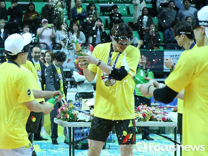 (안산=포커스뉴스) 24일 안산상록수체육관에서 열린 2015-2016 V-리그 남자부 챔피언결정전에서 현대캐피탈을 3승1패로 물리치고 2연패를 달성한 OK저축은행 선수들이 샴페인 세례를 하고 있다.