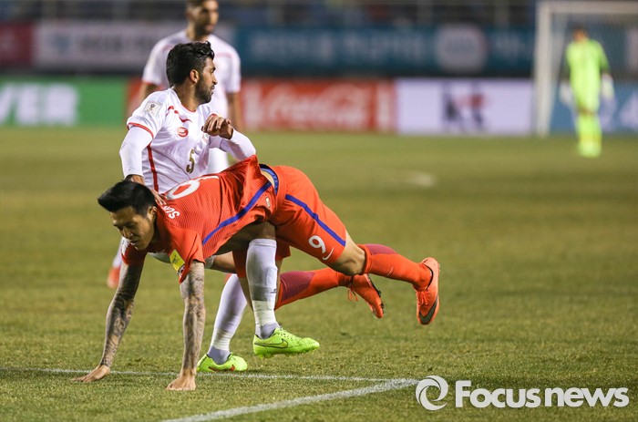 (안산=포커스뉴스) 24일 오후 경기도 안산 와스타디움에서 열린 2018 러시아 월드컵 아시아 2차 예선 7차전 대한민국 대 레바논 경기에서 석현준 선수가 레바논 선수와 거친 몸싸움을 하고 있다.
