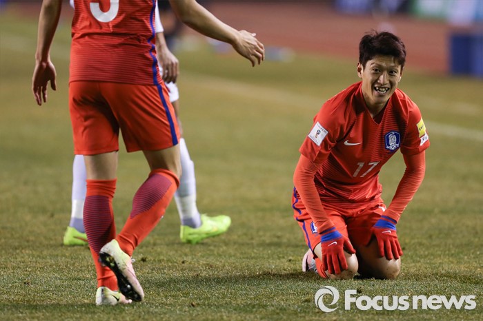 (안산=포커스뉴스) 24일 오후 경기도 안산 와스타디움에서 열린 2018 러시아 월드컵 아시아 2차 예선 7차전 대한민국 대 레바논 경기에서 이청용 선수가 볼다툼 중 넘어져 웃고 있다.