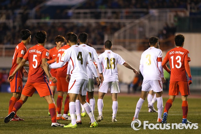 (안산=포커스뉴스) 24일 오후 경기도 안산 와스타디움에서 열린 2018 러시아 월드컵 아시아 2차 예선 7차전 대한민국 대 레바논 경기에서 코너킥을 앞두고 양 팀 선수들이 신경전을 벌이고 있다.