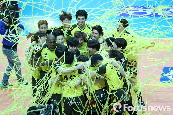 (안산=포커스뉴스) 24일 안산상록수체육관에서 열린 2015-2016 V-리그 남자부 챔피언결정전 4차전에서 OK저축은행이 현대캐피탈을 물리치고 3승1패로 2연패를 달성했다. 김세진 감독과 선수들이 한데 엉켜 우승의 기쁨을 나누고 있다.
