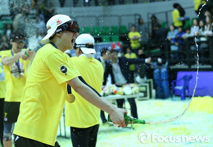 (안산=포커스뉴스) 24일 안산상록수체육관에서 열린 2015-2016 V-리그 남자부 챔피언결정전 4차전에서 OK저축은행이 현대캐피탈을 물리치고 3승1패로 2연패를 달성했다. 시상식후 샴페인 세레를 하며 우승의 기쁨을 만끽하고 있다.