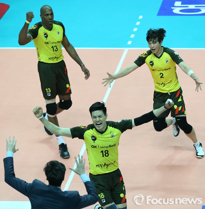 (안산=포커스뉴스) 24일 안산상록수체육관에서 열린 2015-2016 V-리그 남자부 챔피언결정전 4차전에서 OK저축은행이 현대캐피탈을 물리치고 3승1패로 2연패를 달성했다. 선수들이 환호하며 김세진 감독에게 달려가고 있다.