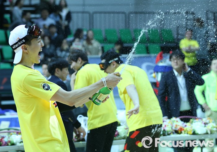 (안산=포커스뉴스) 24일 안산상록수체육관에서 열린 2015-2016 V-리그 남자부 챔피언결정전 4차전에서 OK저축은행이 현대캐피탈을 물리치고 3승1패로 2연패를 달성했다. 시상식후 샴페인 세레를 하며 우승의 기쁨을 만끽하고 있다.