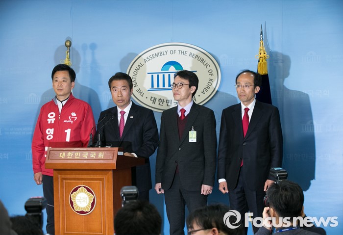 (서울=포커스뉴스) 김무성 새누리당 대표가 무공천을 선언한 지역구 후보들이 25일 오전 서울 여의도 국회 정론관에서 기자회견을 하고 있다. 왼쪽부터 유영하(서울 송파구을), 정종섭(대구 동구갑), 류재길(서울 은평구을), 추경호(대구 달성) 예비후보.