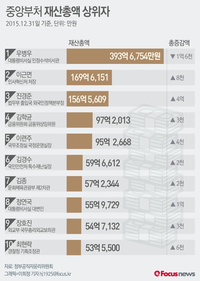 (서울=포커스뉴스) 25일 정부공직자윤리위원회이 발표한 자료에 따르면, 중앙부처 상위 공직자중 우병우 대통령비서실 민정수석 비서관이 총 393억 6,754만원으로 가장 많은 재산을 가진것으로 나타났다.