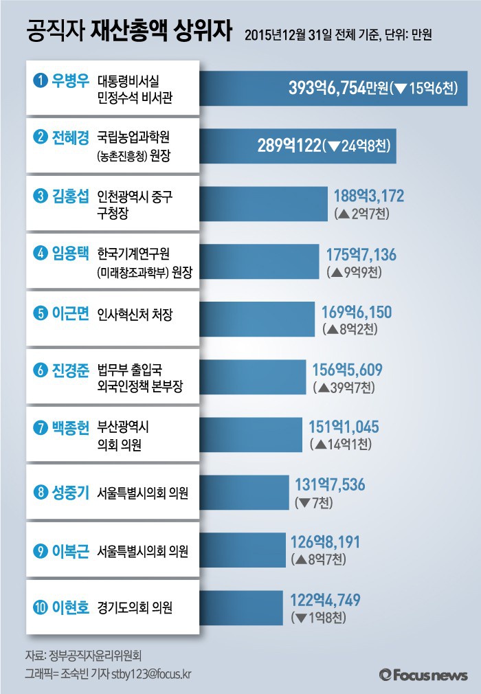 (서울=포커스뉴스) 25일 정부공직자윤리위원회이 발표한 자료에 따르면, 우병우 대통령비서실 민정수석 비서관이 총 393억 6,754만원으로 가장 많은 재산을 가진것으로 나타났다.