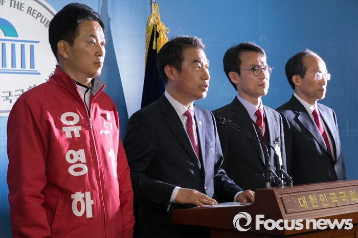 (서울=포커스뉴스) 김무성 새누리당 대표가 무공천을 선언한 지역구 후보들이 25일 오전 서울 여의도 국회 정론관에서 기자회견을 하고 있다. 왼쪽부터 유영하(서울 송파구을), 정종섭(대구 동구갑), 류재길(서울 은평구을), 추경호(대구 달성) 예비후보.