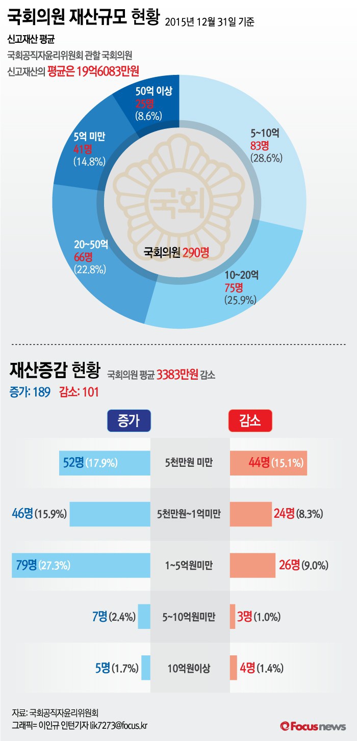 (서울=포커스뉴스) 25일 국회공직자윤리위원회이 발표한 자료에 따르면, 국회의원 290명의 신고재산의 평균은 19억 6,038만원 이다.